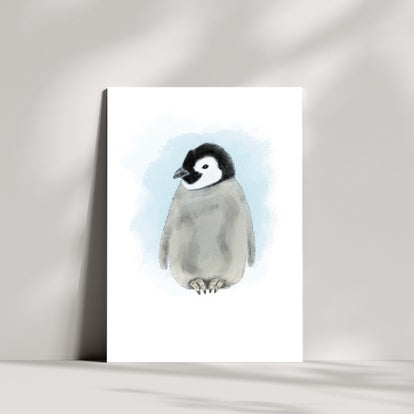 Kaartje met babypinguin op blauw vlak, geschilderd met gouache.