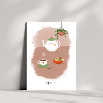Kaartje Thee, een leuke gedetaileerde kaart met theeservies, koekjes en hangplantje. Voor een theeleut, of om iemand uit te nodigen voor een lekker kopje thee.