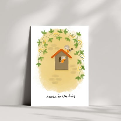 Kaartje samen in een huis met twee lieve roodborstjes in een vogelhuisje, begroeid met klimop. Leuk om te sturen als er iemand gaat samenwonen. Handgeschilderd in gouache