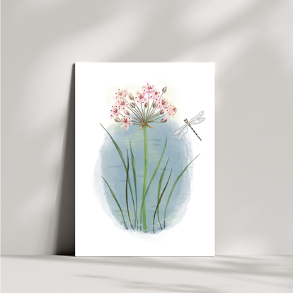 Wenskaart met de mooie Zwanenbloem en Libelle op een blauw vlak met riet erbij. De Zwanenebloem kan je in de lente en zomermaanden langs de sloot zien staan.