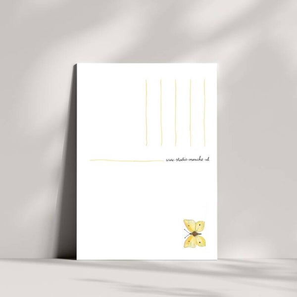 Een mooie kaartje met een damhertje op een geel vlak. Handgeschilderd met gouache.